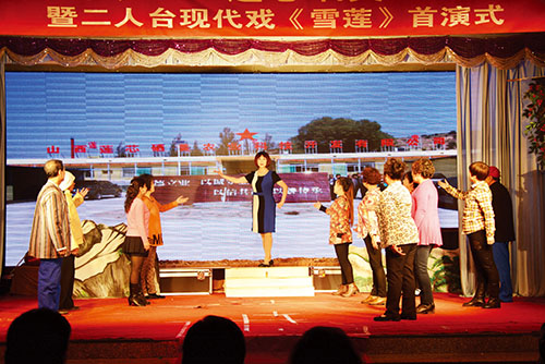 近日,由河曲縣委宣傳部組織策劃推出的二人臺(tái)現(xiàn)代戲《雪蓮》首演獲得圓滿(mǎn)成功,干部群眾反響熱烈。圖為演出劇照。(張健 攝)