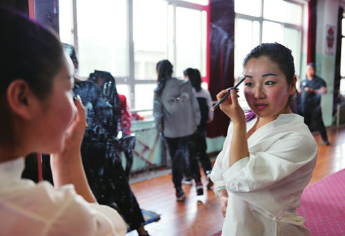 如今的太雨琴是一名北路梆子劇團(tuán)的演員,隨著走向社會(huì),她越發(fā)感覺到肩頭的重任。傳統(tǒng)戲劇,尤其是北路梆子這樣的地方少數(shù)劇種,那種萬(wàn)人爭(zhēng)睹的景象已經(jīng)一去不復(fù)返了?,F(xiàn)在除了一些縣鄉(xiāng)的節(jié)日慶典,很少有人愿意花錢到劇場(chǎng)觀看。這樣一來(lái),北路梆子也就面臨著演出市場(chǎng)萎縮、大量演員流失的狀況。與其說(shuō)太雨琴在靠戲曲吃飯,不如說(shuō)她在用信念堅(jiān)持。(何光暉 攝影報(bào)道)