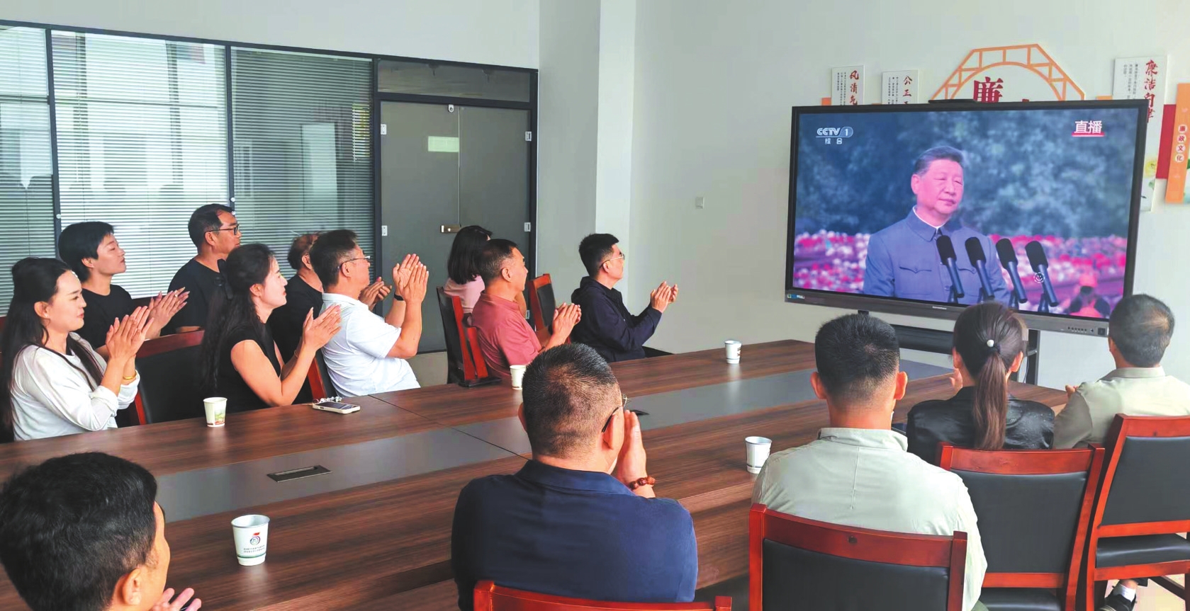 山西金正達(dá)金屬制品有限公司員工觀看紀(jì)念大會(huì)。劉婧攝