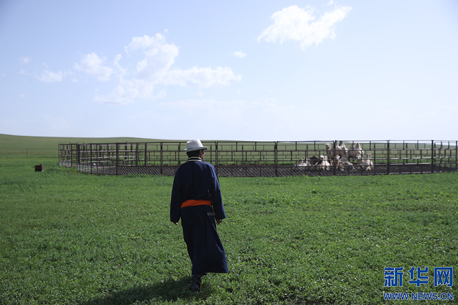 8月2日,其日麥拉圖在自家草場(chǎng)查看駱駝的喂養(yǎng)情況。新華網(wǎng)記者 焦鵬攝