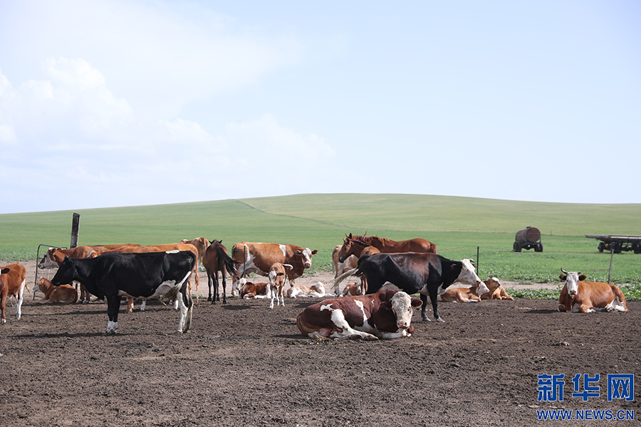 8月2日,其日麥拉圖家的幾頭牛在草場(chǎng)上吃草。新華網(wǎng)記者 焦鵬攝