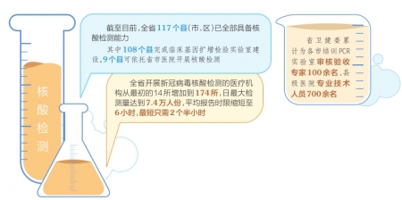 利用核酸檢測開展大范圍篩查,是精準防控疫情的有效手段。省衛(wèi)健委醫(yī)政醫(yī)管局四級調研員趙宏介紹,全省開展新冠病毒核酸檢測的醫(yī)療機構從最初的14所增加到174所,日最大檢測量達到7.4萬人份,平均報告時限縮短至6小時,最短只需2個半小時。