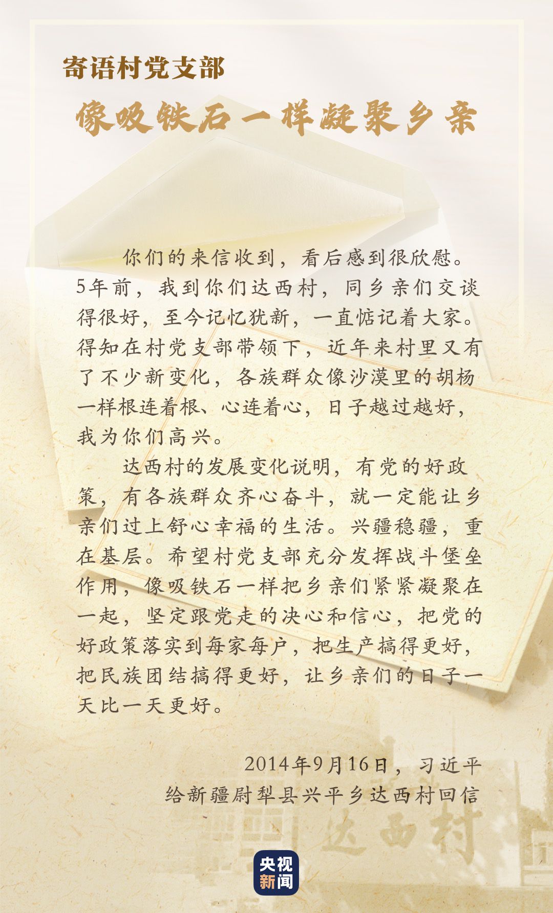 打贏脫貧攻堅(jiān)戰(zhàn),特別要建強(qiáng)基層黨支部。 習(xí)近平多次對(duì)村第一書(shū)記和駐村工作隊(duì)提出要求,“要真抓實(shí)干、堅(jiān)持不懈,真正把讓人民群眾過(guò)上好日子作為自己的奮斗目標(biāo)”。 達(dá)西村地處塔克拉瑪干沙漠東北邊緣,新疆維吾爾自治區(qū)巴音郭楞蒙古自治州尉犁縣城邊上。過(guò)去,這里“一年四季白茫茫,只見(jiàn)播種不見(jiàn)糧”。沙吾爾·芒力克1980年擔(dān)任村黨支部書(shū)記后,帶領(lǐng)各族群眾開(kāi)挖排堿渠,種植防風(fēng)林,發(fā)展集體經(jīng)濟(jì),共同走上致富路。 △達(dá)西村村民在聆聽(tīng)駐村工作隊(duì)隊(duì)員宣講黨的好政策。 “口袋里要鼓囊囊,精神上要亮堂堂”。2014年4月,習(xí)近平在新疆考察時(shí)講到了達(dá)西村的村訓(xùn)。村民們懷著激動(dòng)的心情給總書(shū)記寫(xiě)信,匯報(bào)這些年村里的積極變化。當(dāng)年9月,習(xí)近平總書(shū)記給沙吾爾·芒力克和全體村民回信,強(qiáng)調(diào)興疆穩(wěn)疆,重在基層。 如今,達(dá)西村是3A級(jí)景區(qū)。以達(dá)西展覽館為龍頭,風(fēng)情街、馕產(chǎn)業(yè)街、夜市、風(fēng)情園、香梨園……串聯(lián)起達(dá)西村鄉(xiāng)村旅游格局。