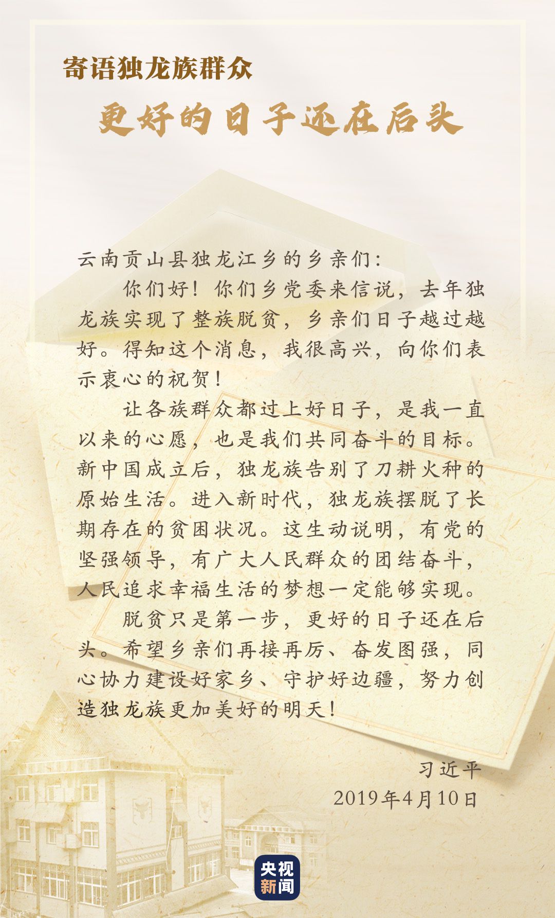 深居祖國(guó)西南邊陲的獨(dú)龍族同胞,一直是習(xí)近平總書(shū)記的牽掛。 2014年元旦前夕,貢山縣干部群眾就給習(xí)近平總書(shū)記寫(xiě)信,報(bào)告多年期盼的高黎貢山獨(dú)龍江公路隧道即將貫通的喜訊??倳?shū)記很快給他們回了信,希望他們“加快脫貧致富步伐,早日實(shí)現(xiàn)與全國(guó)其他兄弟民族一道過(guò)上小康生活的美好夢(mèng)想”。 總書(shū)記的深切關(guān)懷激勵(lì)著獨(dú)龍族干部群眾在全面脫貧、全面建成小康社會(huì)的道路上奮力前行。