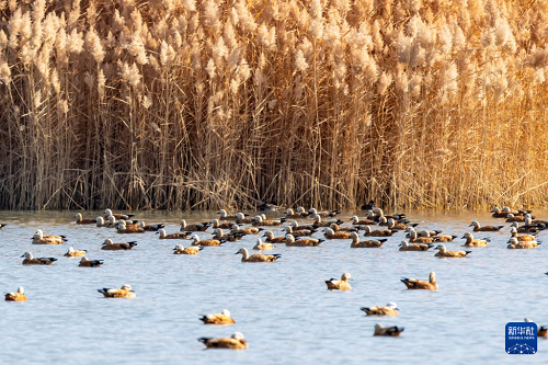 11月12日,赤麻鴨等鳥類在張掖黑河濕地國家級自然保護區(qū)高臺段一處湖泊休憩覓食。(新華社記者 張智敏 攝)