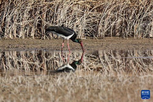 11月12日,黑鸛在張掖黑河濕地國家級自然保護區(qū)高臺段一處濕地淺灘覓食。(新華社記者 郎兵兵 攝)
