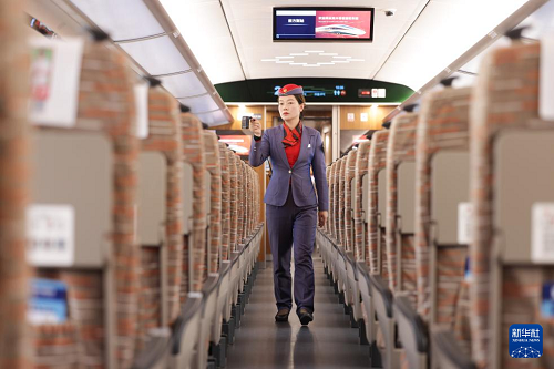 11月17日,乘務(wù)員在一列試驗(yàn)動(dòng)車組內(nèi)工作。(新華社發(fā) 賈智煒 攝)