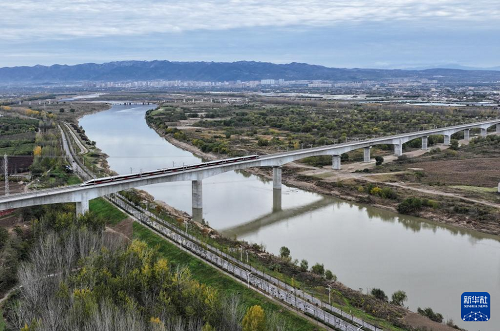 11月17日,一列試驗(yàn)動(dòng)車組通過(guò)西延高鐵渭河特大橋(無(wú)人機(jī)照片)。(新華社記者 張博文 攝)
