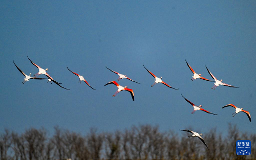 12月8日,火烈鳥(niǎo)在江蘇東臺(tái)條子泥濕地飛翔。(新華社發(fā) 孫家錄 攝)