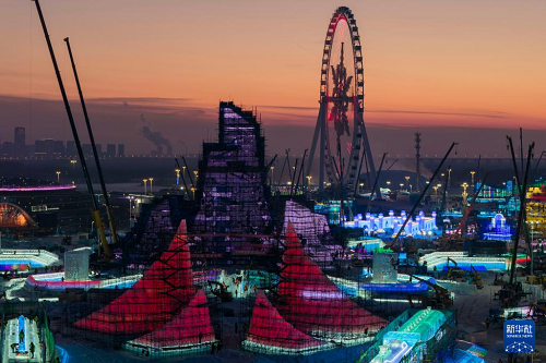 第二十七屆哈爾濱冰雪大世界主塔“冰燈啟夢(mèng)”封頂