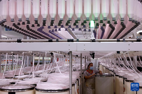 12月16日, 工人在山東棗莊經(jīng)濟(jì)開(kāi)發(fā)區(qū)一家企業(yè)的智能化生產(chǎn)線上加工高端紗線。(新華社發(fā) 孫中喆 攝)
