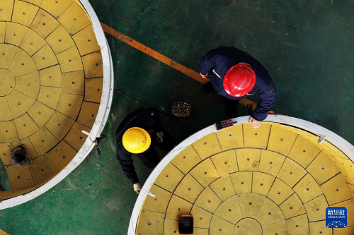 12月16日,在山東青島中青林集團(tuán)有限公司生產(chǎn)車(chē)間,工人在安裝攪拌機(jī)襯板(無(wú)人機(jī)照片)。(新華社發(fā) 王海濱 攝)