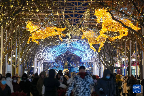 這是哈爾濱中央大街上以“冰雪迎賓 瑞馬迎新”為主題的創(chuàng)意燈飾(12月16日攝)。(新華社記者 王松 攝)