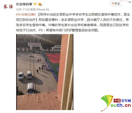 中國(guó)青年網(wǎng)記者就此事向武鄉(xiāng)縣職業(yè)中學(xué)進(jìn)行求證,該校辦公室劉老師稱,目前有二十余位同學(xué)在縣人民醫(yī)院住院治療。事情發(fā)生后學(xué)校領(lǐng)導(dǎo)高度重視,縣領(lǐng)導(dǎo)和教育局領(lǐng)導(dǎo)也都前往醫(yī)院看望生病學(xué)生。