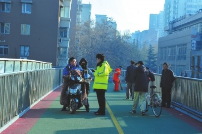 記者了解到,昨天上午9點(diǎn)半到11點(diǎn)一個(gè)半小時(shí)的時(shí)間,交警在該天橋上共處罰10起電動車騎行橫穿過街天橋的違法行為,勸阻12人。