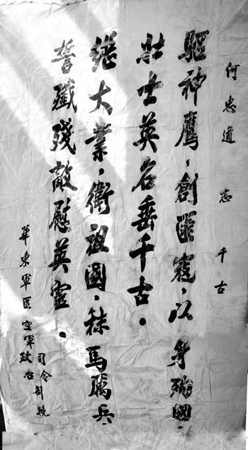 何忠道的犧牲,引起了整個(gè)空軍系統(tǒng)的震憾,人民空軍舉行了隆重的追悼大會(huì)??哲姍C(jī)關(guān)、華東軍區(qū)、生前所在部隊(duì)機(jī)關(guān)、戰(zhàn)友送了幾十幀挽幛。空軍司令員劉亞樓、副司令員常乾坤、副政委吳法憲、參謀長(zhǎng)王秉璋聯(lián)名敬獻(xiàn)的挽幛上書(shū):“殲滅美國(guó)侵略者,堅(jiān)決保衛(wèi)祖國(guó)領(lǐng)空,為何忠道同志復(fù)仇!”華東軍區(qū)司令部、政治部敬獻(xiàn)的挽幛上書(shū):“驅(qū)神鷹,創(chuàng)飛寇,以身殉國(guó),壯士英名垂千古。創(chuàng)大業(yè),衛(wèi)祖國(guó),秣馬厲兵,誓殲殘敵慰英靈?!?/p>