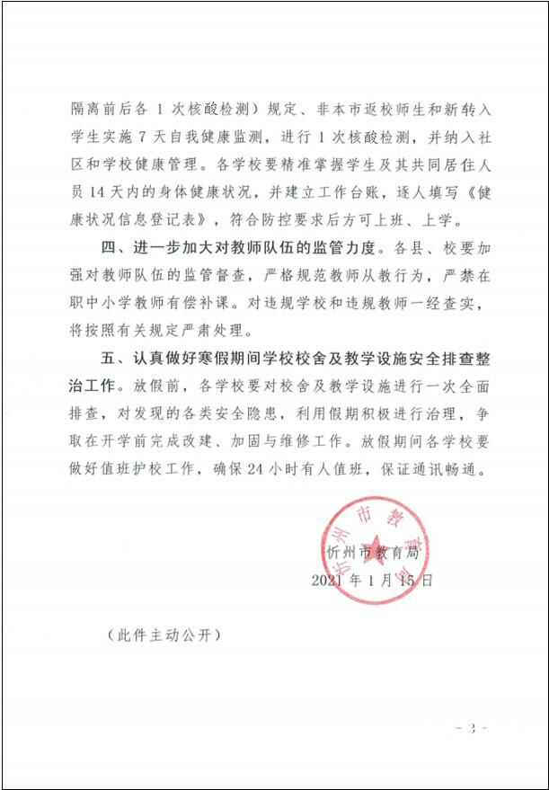 根據(jù)省、市疫情防控工作領(lǐng)導(dǎo)小組及省教育廳視頻會(huì)議精神和我市新冠疫情防控最新形勢,為保障全市師生生命安全和身體健康;經(jīng)市委、市政府同意,現(xiàn)將2021年寒假及假期前后工作安排如下,請遵照執(zhí)行。