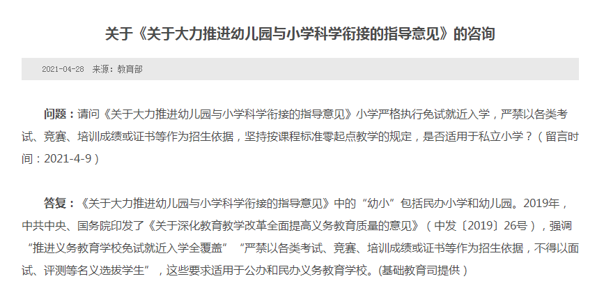 新華網(wǎng)北京4月28日電 近日,教育部在回應(yīng)網(wǎng)友咨詢《關(guān)于大力推進幼兒園與小學科學銜接的指導意見》相關(guān)問題時表示,該指導意見中的“幼小”包括民辦小學和幼兒園。2019年,中共中央、國務(wù)院印發(fā)了《關(guān)于深化教育教學改革全面提高義務(wù)教育質(zhì)量的意見》(中發(fā)〔2019〕26號),強調(diào)“推進義務(wù)教育學校免試就近入學全覆蓋”“嚴禁以各類考試、競賽、培訓成績或證書等作為招生依據(jù),不得以面試、評測等名義選拔學生”,這些要求適用于公辦和民辦義務(wù)教育學校。