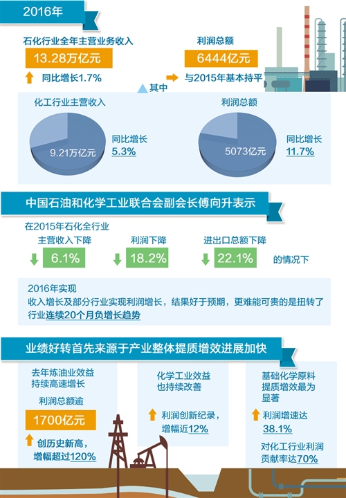 來自中國石油和化學(xué)工業(yè)聯(lián)合會(huì)的信息顯示,2016年,石化行業(yè)全年主營業(yè)務(wù)收入13.28萬億元,同比增長1.7%,利潤總額6444億元,與2015年基本持平;其中化工行業(yè)主營收入9.21萬億元、同比增長5.3%,利潤總額5073億元、同比增長11.7%。中國石油和化學(xué)工業(yè)聯(lián)合會(huì)副會(huì)長傅向升表示,在2015年石化全行業(yè)主營收入下降6.1%、利潤下降18.2%、進(jìn)出口總額下降22.1%的情況下,2016年實(shí)現(xiàn)收入增長及部分行業(yè)實(shí)現(xiàn)利潤增長,結(jié)果好于預(yù)期。更難能可貴的是,扭轉(zhuǎn)了行業(yè)連續(xù)20個(gè)月負(fù)增長趨勢。