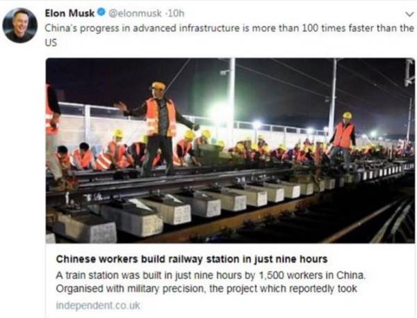 央廣網(wǎng)北京2月28日消息 近年來(lái),中國(guó)速度日益引發(fā)外媒關(guān)注。今天(28日),一段中國(guó)工人在火車站施工的視頻又走紅美國(guó),剛剛將跑車送上太空的企業(yè)家馬斯克(Elon Musk)也忍不住轉(zhuǎn)發(fā)贊嘆,“中國(guó)先進(jìn)基礎(chǔ)設(shè)施發(fā)展速度比美國(guó)快了100多倍”。