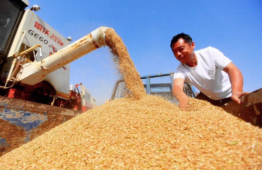 山東省臨沂市平邑縣地方鎮(zhèn)農(nóng)民將收獲的小麥裝車(6月13日攝)。(新華社發(fā),武紀(jì)全攝)
