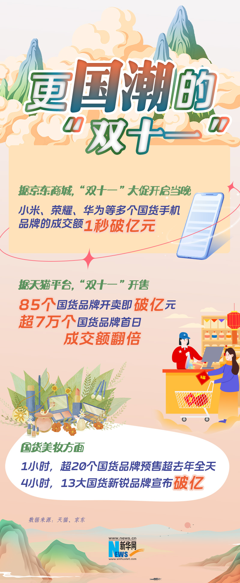 公開數(shù)據(jù)顯示,10月23日京東“雙十一”開啟當(dāng)晚,小米、榮耀、華為等多個(gè)國貨手機(jī)品牌的成交額1秒破億元;10月31日晚天貓“雙十一”正式開售,85個(gè)國貨品牌開賣即破億元,超7萬個(gè)國貨品牌首日成交額翻倍。