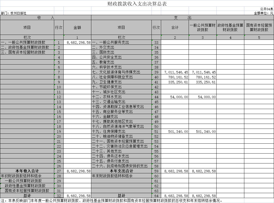 四、財(cái)政撥款收入支出決算總表