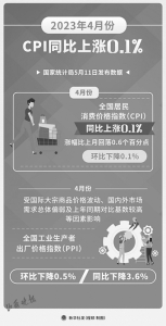 據(jù)新華社電 國(guó)家統(tǒng)計(jì)局11日發(fā)布數(shù)據(jù),4月份,全國(guó)居民消費(fèi)價(jià)格指數(shù)(CPI)同比上漲0.1%,漲幅比上月回落0.6個(gè)百分點(diǎn)。