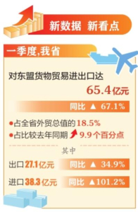 本報(bào)訊(記者孟婷)5月15日,記者從太原海關(guān)獲悉,今年一季度,我省對(duì)東盟貨物貿(mào)易進(jìn)出口達(dá)65.4億元,同比增長67.1%,占全省外貿(mào)總值的18.5%,占比較去年同期提升9.9個(gè)百分點(diǎn)。其中,出口27.1億元,同比增長34.9%;進(jìn)口38.3億元,同比增長101.2%。3月份,我省對(duì)東盟進(jìn)出口25.8億元,同比增長101.4%,其中出口11億元,同比增長50%;進(jìn)口14.8億元,同比增長169.6%。