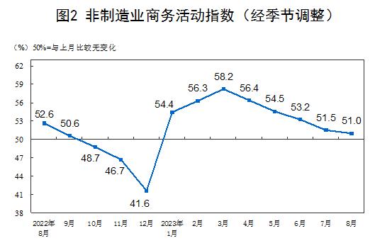 此外,在中國非制造業(yè)采購經(jīng)理指數(shù)運(yùn)行情況方面,8月份,非制造業(yè)商務(wù)活動指數(shù)為51.0%,比上月下降0.5個(gè)百分點(diǎn),仍高于臨界點(diǎn),非制造業(yè)持續(xù)擴(kuò)張。