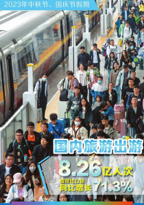 經(jīng)文化和旅游部數(shù)據(jù)中心測算,2023年中秋節(jié)、國慶節(jié)假期,全國國內(nèi)旅游出游人數(shù)8.26億人次,同比增長71.3%,按可比口徑較2019年增長4.1%;實(shí)現(xiàn)國內(nèi)旅游收入7534.3億元,同比增長129.5%,按可比口徑較2019年增長1.5%。