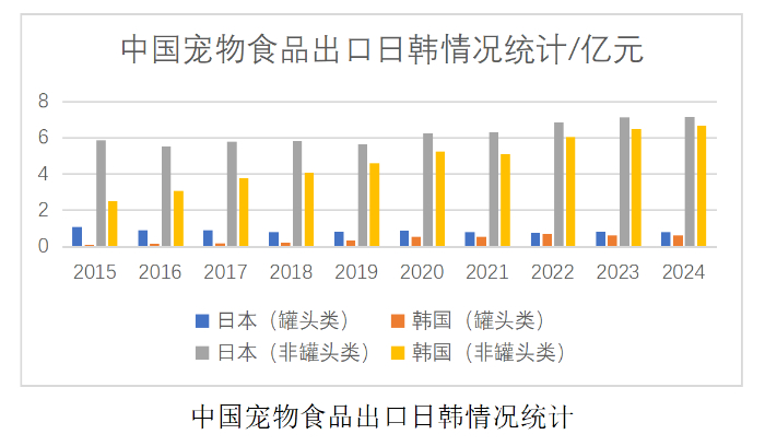 王金全分析認(rèn)為,日韓是我國(guó)寵物食品重要出口地,2022年占出口總額12%,中國(guó)品牌憑性價(jià)比與差異化切入日本市場(chǎng),2024年對(duì)韓非罐裝類(lèi)出口額較2015年翻倍。