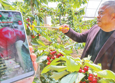 4月9日,秦皇島市海港區(qū)海陽(yáng)鎮(zhèn)鯉泮莊村的祺和大櫻桃種植基地內(nèi),村民蘇士明使用網(wǎng)絡(luò)平臺(tái)直播推銷(xiāo)大櫻桃。 人民視覺(jué)