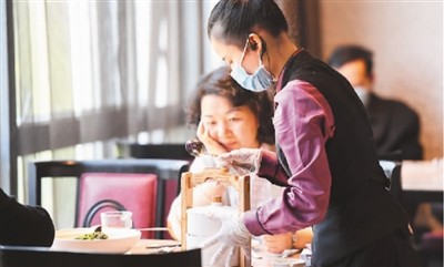 4月13日,在河北廊坊市安次區(qū)一家餐廳,廚師為客人分餐。新華社發(fā)