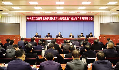 圖為中央第二生態(tài)環(huán)境保護(hù)督察組對(duì)山西省開展“回頭看”忻州市動(dòng)員會(huì)會(huì)場(chǎng)。趙菁 攝