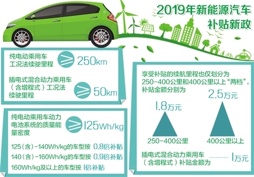 2019年新政提出:純電動(dòng)乘用車(chē)工況法續(xù)駛里程不低于250公里,插電式混合動(dòng)力乘用車(chē)(含增程式)工況法續(xù)駛里程不低于50公里,享受補(bǔ)貼的續(xù)航里程也僅劃分為250至400公里和400公里以上“兩檔”,補(bǔ)貼金額分別為1.8萬(wàn)元和2.5萬(wàn)元,插電式混合動(dòng)力乘用車(chē)(含增程式)補(bǔ)貼金額為1萬(wàn)元。