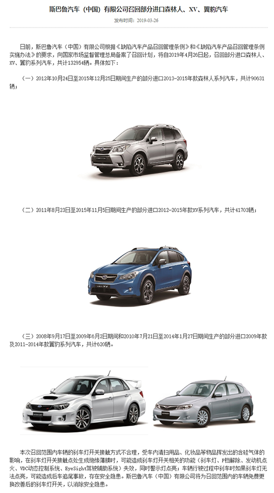 從召回原因來看,本月斯巴魯涉及132954輛汽車的召回不僅數(shù)量最大,召回原因也頗具“創(chuàng)意”。該批車輛因剎車燈開關(guān)接觸方式不合理,受車內(nèi)清掃用品、化妝品等物品揮發(fā)出的含硅氣體的影響,在剎車燈開關(guān)接觸點(diǎn)處生成絕緣薄膜時,可能造成剎車燈開關(guān)相關(guān)的功能(剎車燈、P檔解除、發(fā)動機(jī)點(diǎn)火、VDC動態(tài)控制系統(tǒng)、EyeSight駕駛輔助系統(tǒng))失效,同時警示燈點(diǎn)亮;車輛行駛過程中剎車時如果剎車燈無法點(diǎn)亮,可能造成后車追尾事故,存在安全隱患。