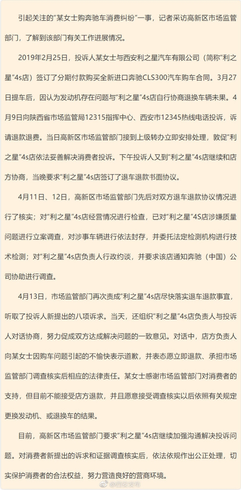 據(jù)西安市互聯(lián)網(wǎng)信息辦公室官方微博消息稱,4月13日,高新區(qū)市場監(jiān)管部門曾組織利之星4S店負(fù)責(zé)人與投訴人進(jìn)行對話協(xié)商。對話中,店方負(fù)責(zé)人向奔馳女車主因購車問題引起的不愉快表示道歉,并表態(tài)愿立即退款、承擔(dān)市場監(jiān)管部門調(diào)查核實(shí)后相應(yīng)的法律責(zé)任。該奔馳女車主感謝市場監(jiān)管部門對消費(fèi)者的支持,但目前不能接受店方退款,也愿意接受調(diào)查核實(shí)以后依照有關(guān)規(guī)定更換發(fā)動(dòng)機(jī)、或退換車的結(jié)果。