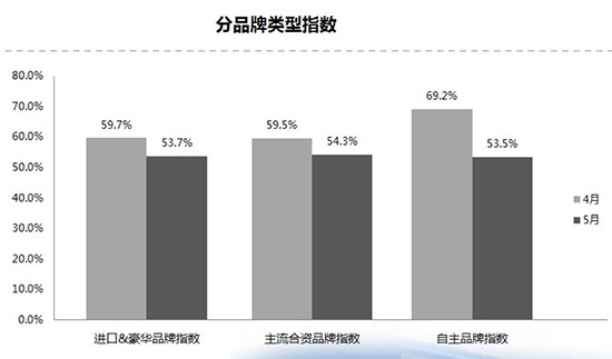 從數(shù)據(jù)上看,5月北區(qū)庫(kù)存預(yù)警指數(shù)為54.7%,東區(qū)指數(shù)為49.4%,南區(qū)指數(shù)58%,西區(qū)指數(shù)56.9%。分品牌來(lái)看,5月進(jìn)口&豪華品牌指數(shù)、合資品牌指數(shù)、自主品牌指數(shù)較上月下降;另由于部分省市7月1日提前實(shí)施國(guó)六標(biāo)準(zhǔn),5月經(jīng)銷商加大了對(duì)國(guó)五車(chē)清庫(kù)力度,總體庫(kù)存水平有所下降。