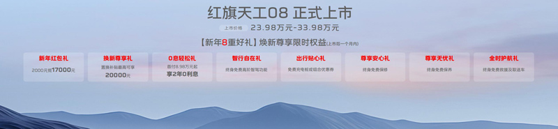 逐夢新程,臻享超值。天工08共推出兩驅(qū)和四驅(qū)2種驅(qū)動模式共5個版本供選擇,官方指導(dǎo)價為23.98萬元-33.98萬元。同時,購買天工08的消費(fèi)者還可尊享“新年8重好禮”限時權(quán)益,即刻購車可享2000元抵17000元的新年紅包禮;置換補(bǔ)貼最高可享20000元的換新尊享禮;首付8.98萬元起、享2年0利息的0息輕松禮;終身免費(fèi)高階智駕功能的智行自在禮;免費(fèi)充電樁或組合優(yōu)惠券的出行貼心禮;終身免費(fèi)保修的尊享安心禮;終身免費(fèi)保養(yǎng)的尊享無憂禮;終身免費(fèi)救援及取送車的全時護(hù)航禮。從購車成本到金融方案,再到智駕裝備、質(zhì)量保障等方方面面,紅旗以超值權(quán)益帶來進(jìn)階的價值體驗(yàn),讓用戶買得舒心、用得安心。