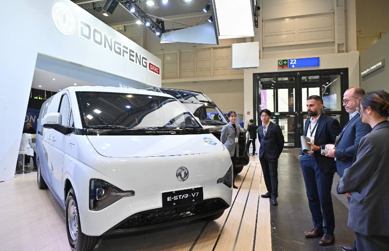 (資料圖片)2024年9月16日,在德國漢諾威國際交通運(yùn)輸博覽會媒體預(yù)展上,人們在東風(fēng)汽車展區(qū)參觀E-STAR V7商用車。新華社記者 任鵬飛 攝