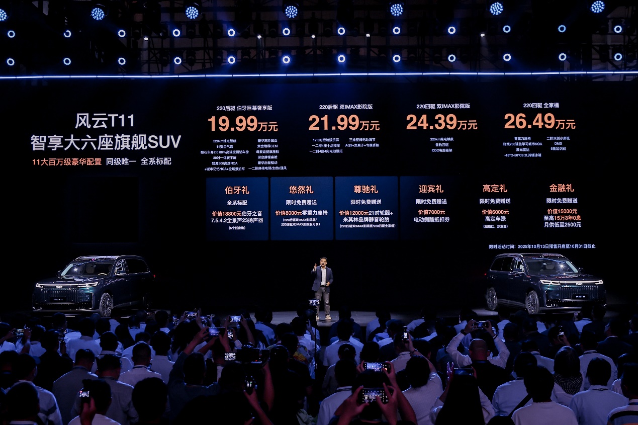 在智能座艙體驗上,風(fēng)云T11多屏全維交互支持信息跨屏流轉(zhuǎn)與分屏操作,副駕娛樂與主駕導(dǎo)航互不干擾,滿足全家出行時的多元需求。全新小奇同學(xué)AI語音助手不僅支持多音區(qū)識別和自然對話,還能聽懂方言,讓全車人都能“動口不動手”地控制車輛功能。配合AI智慧無麥K歌,可為用戶的聲音美顏,將座艙變?yōu)槌两降囊苿右魳窂d。 風(fēng)云T11的智慧關(guān)懷更延伸至車輛全生命周期。AI智能電池管理系統(tǒng)提供24小時云端監(jiān)測與預(yù)警,并能有效延長電池壽命,讓用戶遠離電量焦慮,用車更安心。AI數(shù)字底盤則帶來CST舒適制動與智能防暈車功能,讓大車操控如小車般靈活精準(zhǔn),全家乘坐更穩(wěn)更舒適。 十一大全系標(biāo)配,詮釋“入門即豪華”的誠意 除了預(yù)售19.99萬元起的誠意,風(fēng)云T11還以十一大百萬級別的標(biāo)配。11安全氣囊、磐石車身2.0、30吋一體寰宇屏、伯牙之音23揚音響、母嬰級健康座艙、深空靜謐座艙、豪華高階底盤、220km+超長純電續(xù)航、黃金增程CEM、獵鷹高階駕駛輔助系統(tǒng)以及四驅(qū)/后驅(qū)旗艦動力。十一項高端配置均為全系標(biāo)配,無需用戶糾結(jié)選配。