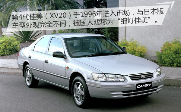 第4代佳美(XV20)于1996年進(jìn)入市場(chǎng),進(jìn)入國(guó)內(nèi)的仍是佳美海外版車(chē)型,在設(shè)計(jì)上與日本本土版采用了完全不同的理念。讓整車(chē)看上去更加修長(zhǎng)流暢,車(chē)頭和車(chē)尾都被設(shè)計(jì)得趨于扁平,由此帶來(lái)的是更細(xì)長(zhǎng)的頭燈和尾燈,所以XV20在國(guó)內(nèi)被人們戲稱(chēng)為“細(xì)燈佳美”。