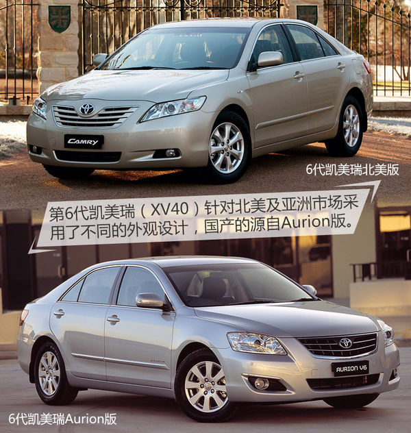 第6代凱美瑞(XV40)誕生于2006年,6月17日正式上市,由廣汽豐田進(jìn)行本土化生產(chǎn)。雖然是豐田的全球化車(chē)型,但是XV40針對(duì)北美及亞洲市場(chǎng)采用了不同的外觀設(shè)計(jì)。北美版的車(chē)燈更加“鋒利”更加年輕運(yùn)動(dòng),而國(guó)產(chǎn)的凱美瑞則采用了更加符合東方審美的亞洲版造型,又被稱(chēng)作Prestige版或Aurion版。