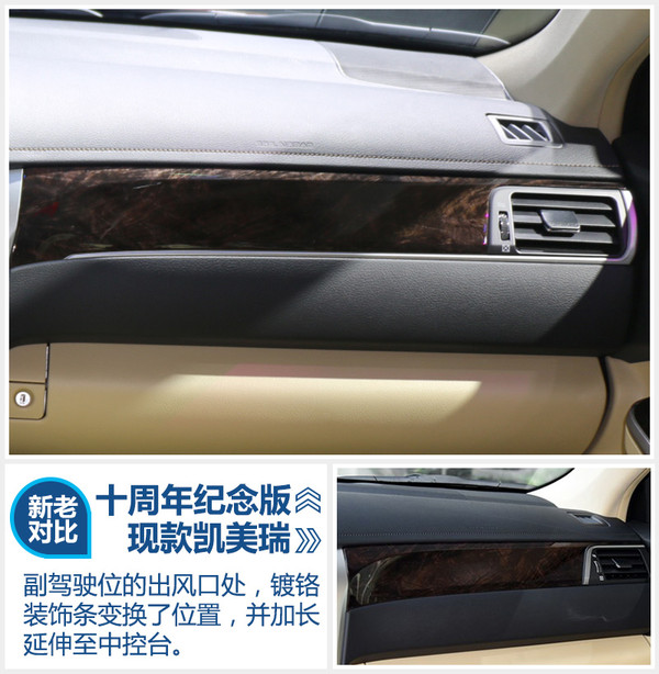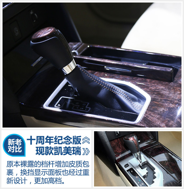 凱美瑞的“蛇形”換擋機(jī)制一直是筆者非常喜歡的設(shè)計(jì),最起碼在開(kāi)車(chē)的時(shí)候不會(huì)因?yàn)閾Q錯(cuò)擋而發(fā)生意外碰撞。但是說(shuō)實(shí)話,裸露的檔桿總覺(jué)得缺了點(diǎn)什么。十周年紀(jì)念版將檔桿周?chē)由狭似べ|(zhì)包裹,立馬將中控臺(tái)的“氣質(zhì)”提升了一個(gè)檔次,筆者本人是非常喜歡的。另外,副駕駛面前的木紋面板也增加了一條鍍鉻裝飾。