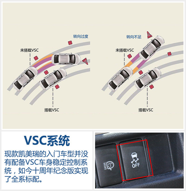 目前在售的現(xiàn)款凱美瑞入門(mén)版車(chē)型,并沒(méi)有配備VSC車(chē)型穩(wěn)定控制系統(tǒng),這對(duì)于預(yù)算有限的消費(fèi)者來(lái)說(shuō),原本可以成為購(gòu)買(mǎi)目標(biāo)的凱美瑞,很有可能就因?yàn)檫@一個(gè)配置被篩掉了。如今,十周年紀(jì)念版實(shí)現(xiàn)了全系車(chē)型標(biāo)配VSC系統(tǒng)。