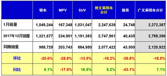 具體車型方面,1月SUV和轎車的銷量環(huán)比均出現(xiàn)下滑,同比則大幅增長,這也是1月份乘用車市場實現(xiàn)開門紅的主要動力;而MPV仍沒有復蘇的跡象,銷量同環(huán)比均出現(xiàn)下滑。