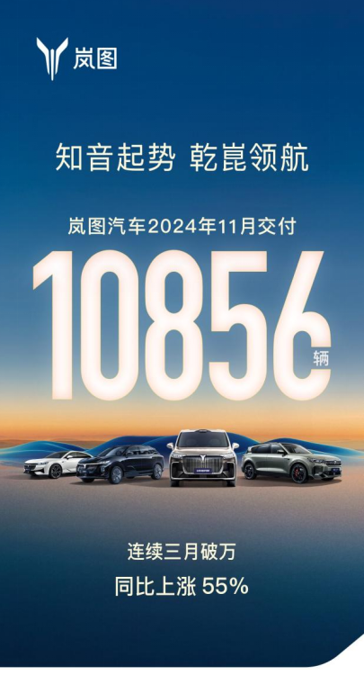 12月1日,嵐圖汽車公布2024年11月交付數(shù)據(jù)。11月,嵐圖汽車交付量攀升至10856輛,同比增長(zhǎng)55%,連續(xù)三個(gè)月躋身“萬(wàn)輛俱樂(lè)部”。1-11月,嵐圖汽車?yán)塾?jì)交付73561輛,同比增長(zhǎng)81%。背靠東風(fēng)集團(tuán)55年的造車功底,再加上極其“聽(tīng)勸”的態(tài)度,嵐圖汽車迎來(lái)銷量“七連漲”,成為高端新能源國(guó)家隊(duì)名副其實(shí)的優(yōu)等生和領(lǐng)跑者。