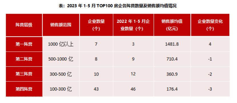 同時(shí),1-5月,千億以上陣營(yíng)企業(yè)數(shù)量增加。具體來(lái)看,千億以上陣營(yíng)7家,較去年同期增加4家,銷(xiāo)售額均值1481.8億元。第二陣營(yíng)(500-1000億元)企業(yè)8家,較去年同期減少1家,銷(xiāo)售額均值710.4億元。第三陣營(yíng)(300-500億元)企業(yè)10家,較去年同期減少2家,銷(xiāo)售額均值360.9億元。第四陣營(yíng)(100-300億元)企業(yè)為43家,較去年同期減少3家,銷(xiāo)售額均值176.4億元。