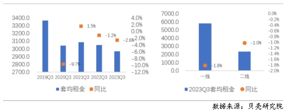 圖8 2023年三季度重點(diǎn)40城不同能級(jí)城市租金及同比變化